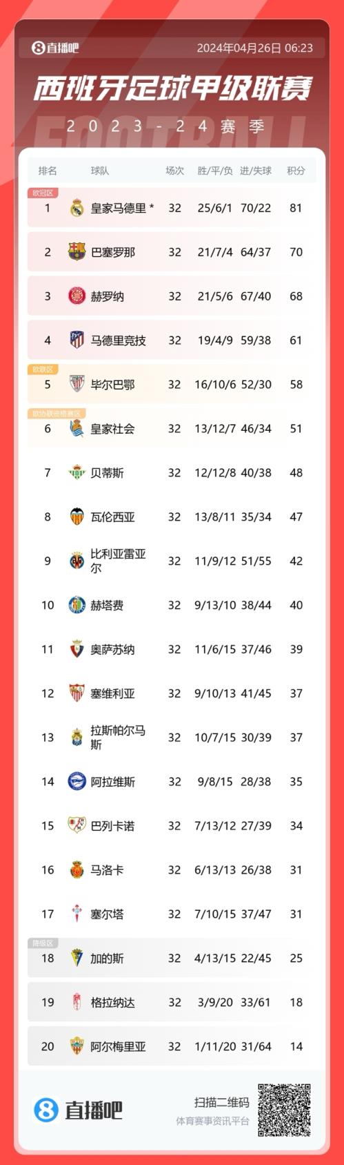 西甲降级区三队是加的斯、格拉纳达和阿尔梅里亚。阿尔梅里亚落后塞尔塔达17分,下场对阵赫塔费若不胜也将提前降级。